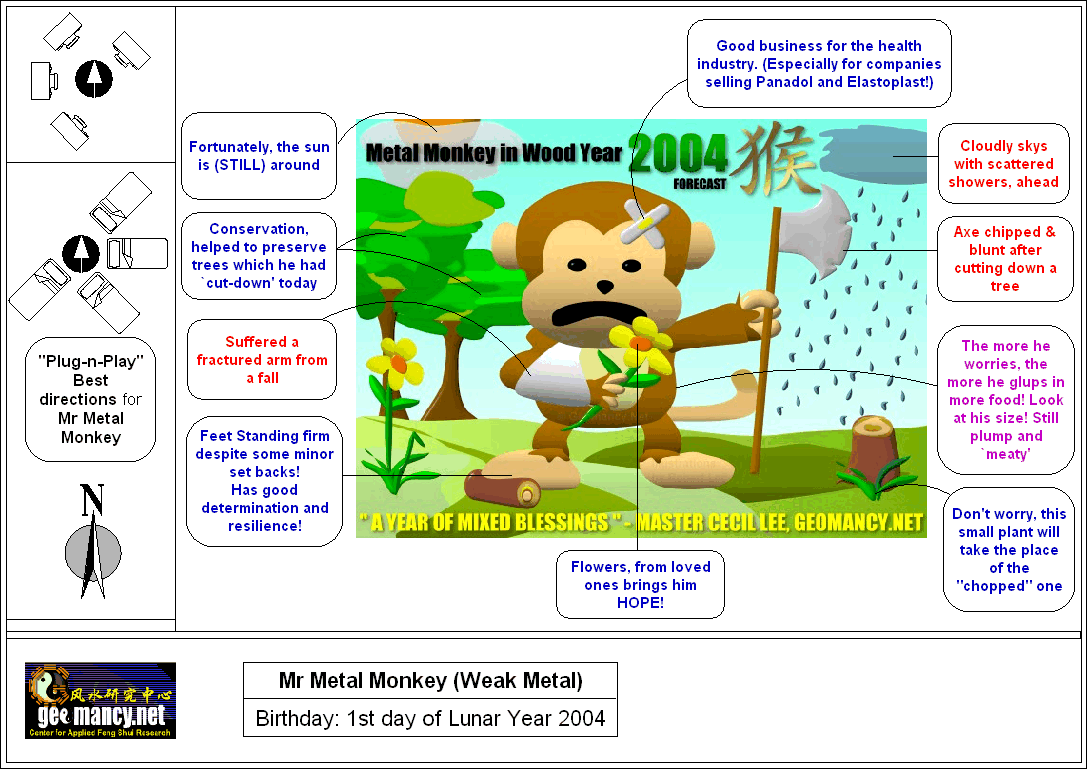 2004 is the Year of Monkey, where the Heavenly Stem of the Year is Wood while Earthly branch is Metal. When Metal Monkey attempts to chop tress, the monkey has both gains and injuries. So some difficulties can be expected.